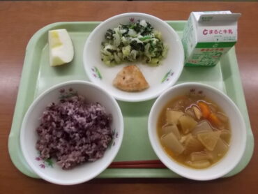今日の給食では、食べやすいように白い米に雑穀の「香紫米」を混ぜた「赤米ごはん」にしています。