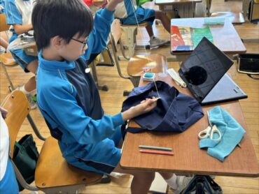 家庭科では、ミシンを使ってマイバックを作っています。縫い目がガタガタにならないように慎重に縫いました。ミシンが終わった後は、手縫いで各々が刺繍を縫い付けました。