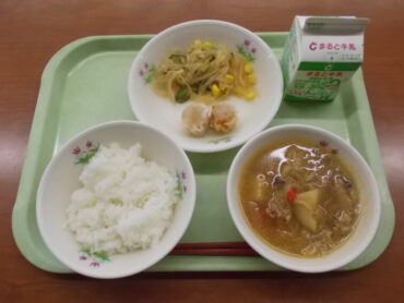 今日の献立は、牛乳、ごはん、えびシューマイ、バンサンスー、韓国風肉じゃがです。