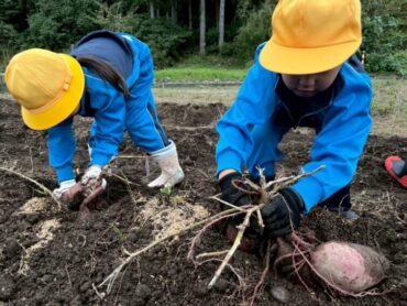 「根っこの部分を持って、ゆらゆら動かしながら抜くと抜きやすいよ」と丁寧に教えていただいたおかげで、たくさんのさつまいもを収穫することができました。重たいさつまいもが抜けた時は、「大きい!」「やっと抜けた!」と笑顔で話していました。また、友達と協力し合って収穫する様子も見られました。