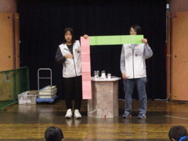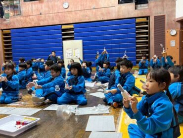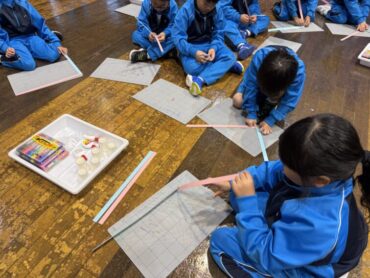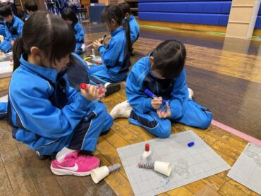 太閤山ランド内の「こどもみらい館」で、工作をしました。プラスチックのコップを、魚や虫、トランポリンの上で跳ぶ子供に見立てて、紙バネで飛ばして遊びました。友達と自分の作ったものを見せ合うなど、楽しんで活動していました。