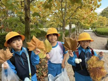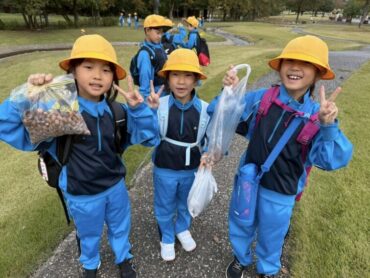 生活科の授業で、秋祭りを開くために、秋の自然も探してきました。形の違うどんぐりや、顔よりも大きい落ち葉があり、子供たちはびっくりしながら、必要なものを集めていました。