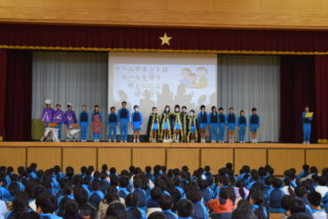 最初に保健委員会の児童が、劇を交えてメディアアンケート等の結果やメディア依存になるとどうなるかについて発表しました。