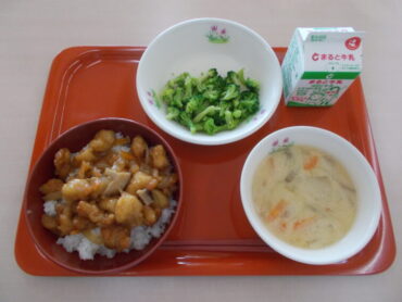 今日の献立は、牛乳、国吉きのこのチキン南蛮丼、ゆでブロッコリー、豆乳汁です。