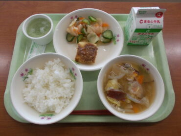 今日の献立は、牛乳、ごはん、揚げ出し豆腐のごまだれ、かぶの色とり、豚汁、青りんごゼリーです。