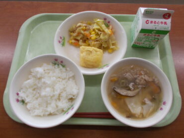 今日の献立は、牛乳、ごはん、厚焼き卵、きゃべつとコーンのソテー、ワンタンスープです。