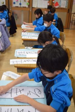校内書初大会では、冬休みの成果を発揮できるよう、心を込めて力強く書きました。