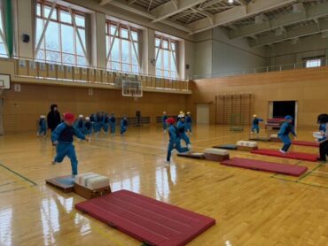 踏み越し跳び、またぎ越し跳びなど、色々な跳び方で跳んでいます。強く踏み切ることや、両足で着地することを意識してがんばっています。