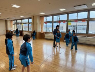 「縄の真ん中で跳ぶといいよ!」「惜しいよ!次がんばろう!」と、アドバイスしたり励まし合ったりしながら、友達と協力して取り組んでいます。