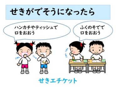 そのため、「せきエチケット」として、咳やくしゃみが出るときは、なるべく手の平ではなく肘の内側やティッシュ等でうけとめるとよいでしょう。