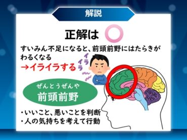 睡眠不足になると、脳の前頭前野という部分の働きが悪くなり、判断力が落ちてしまったり、イライラしやすくなってしまったりするなど、心身によくない影響が表れます。