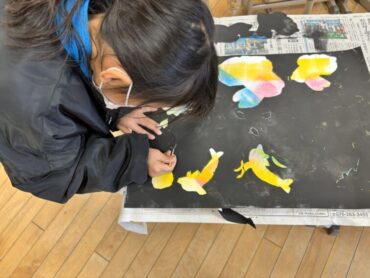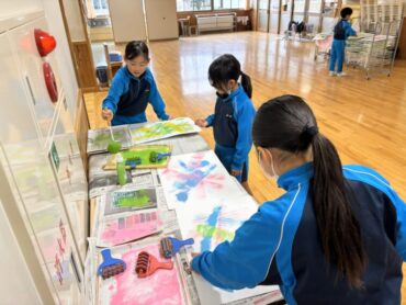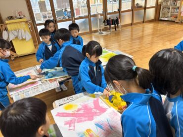 2026.2.3 NEW 2年生 2年生 図画工作科の作品、完成 図工製作では、型紙版画「いっぱい うつして」をしました。 画用紙に明るい色の絵の具をローラーで色付けします。その上に、動物や生き物、植物等の型紙を画用紙に置き、上から黒い絵の具を色付けします。そして、型紙を外すと、明るい色の動物たちが色鮮やかに出てきます。子供たちはその鮮やかさに喜び、楽しそうに一枚一枚丁寧に外していました。
