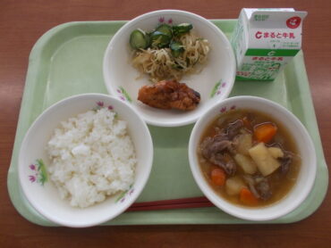 今日の献立は、牛乳、ごはん、鶏肉の塩こうじ揚げ、もやしときゅうりの生姜和え、肉じゃがです。