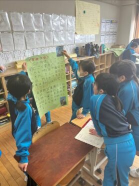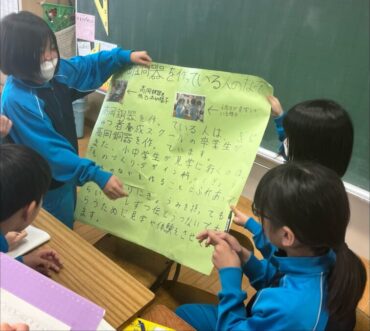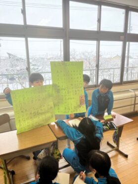 資料や写真を参考にしながら、人々が伝統を守るためにどのような工夫や努力をしているのかなどをまとめ、発表し合いました。